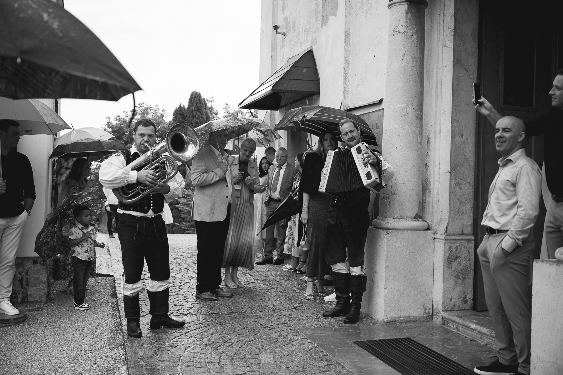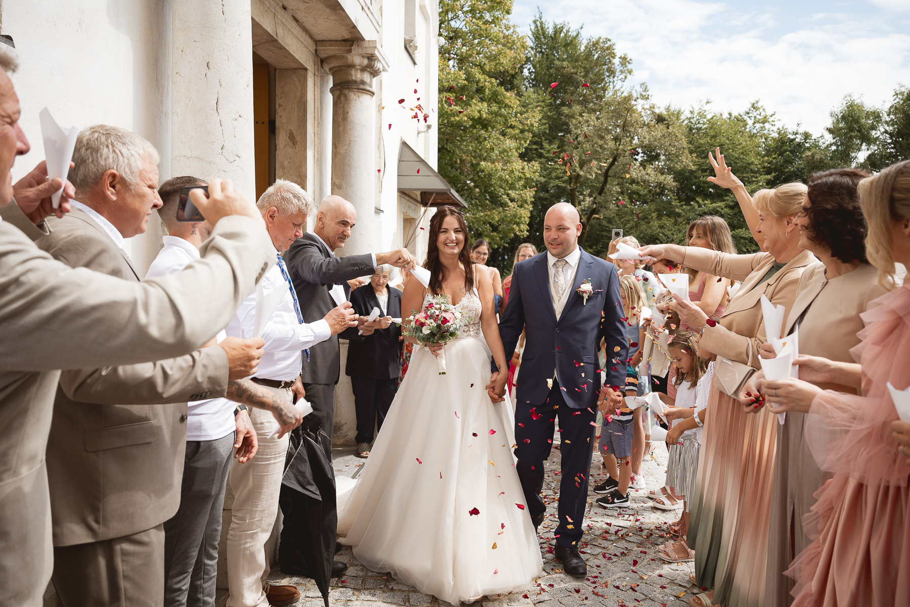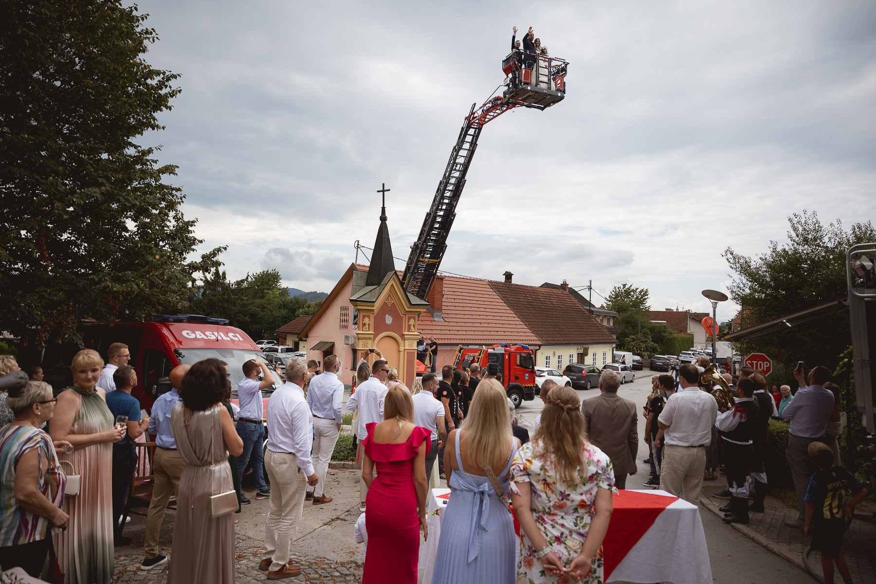 Zvonovi so oznanili začetek zgodbe, ko sta pred oltar stopila z odločitvijo, ki ne potrebuje velikih besed. Po poti skozi vas ju je spremljal ritem konjskih kopit. Vožnja s kočijo ni bila le prevoz, temveč prehod iz obreda v praznovanje, iz zbranosti v sproščenost.